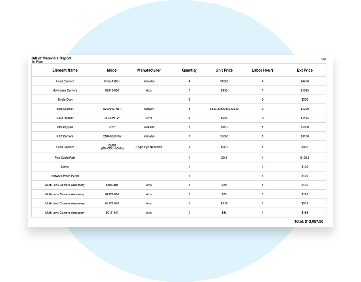 Go from system design to immediate totals by element in one-click. View on screen totals so that you can review your work. Include associated accessories with devices – think mounts, brackets and lenses for cameras, for example. No more guessing which accessory goes with which device. Automate more of the process.